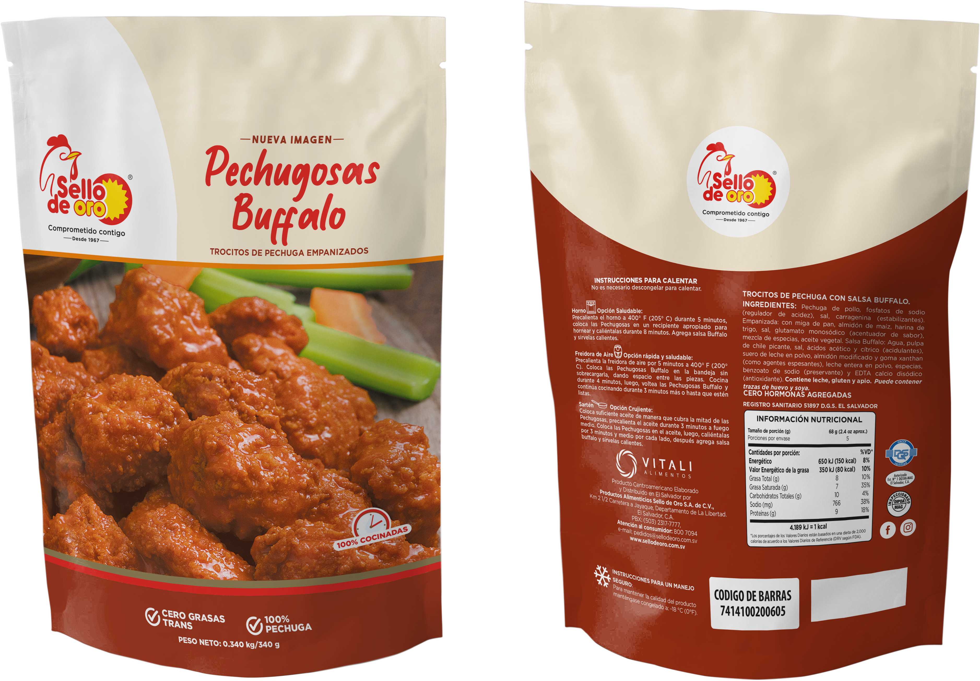 Precalienta el horno a 400° F (205° C) durante 5 minutos, coloca las Pechugosas en un recipiente apropiado para hornear y caliéntalas durante 8 minutos. Agrega salsa Buffalo y sírvelas calientes.